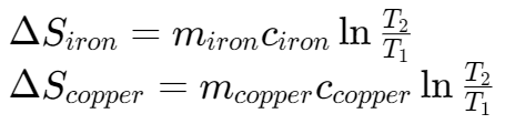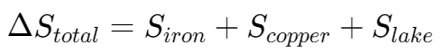 A 50-kg iron block and a 20-kg copper block, both initially at 80°C, are dropped into a large lake at 15°C. Thermal equilibrium is established after a while as a result of heat transfer between the blocks and the lake water. Determine the total entropy change for this process.